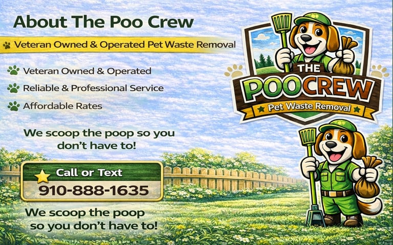 The Poo Crew is a local veteran owned and operated pet waste removal company serving dog owners throughout Harnett, Lee, Cumberland, Moore, Southern Wake Counties, and surrounding areas.